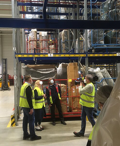 Im April war eine Reporterin der Sendung MOMA samt Kamerateam (siehe Foto) in Löhne, um der Frage nachzugehen: „Was passiert eigentlich mit dem, was wir online bestellt haben, aber nicht haben wollen? Schuhe, die nicht passen, oder der Pulli, der nicht gefällt – kein Problem, wird zurückgeschickt! Das gilt auch für Rasenmäher, Spülmaschinen oder Fernseher, die dann doch die falschen Maße haben: zurück und neu bestellen. Welche Ausmaße das Retourengeschäft inzwischen angenommen hat, was genau mit den oft neu verpackten Rücksendungen geschieht, erlebte unsere MOMA-Reporterin Jacqueline Dreyhaupt in einem Retourenzentrum in Löhne bei Bielefeld. Die 200 Mitarbeiter dort fahren gerade nach den Ostertagen wieder Sonderschichten, weil genau hierhin viele Online-Händler ihre Ware zurücksenden lassen. Darunter findet sich auch mal ein Kühlschrank, der noch mit Lebensmitteln gefüllt ist...“ [ARD 2022].