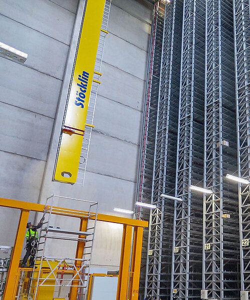 Bislang kommen 39 RBG zum Einsatz, die mithilfe von acht Umsetzern die Gasse wechseln können. Künftig wird jede der 61 Gassen von jeweils einem Gerät bedient. Das Umsetzen entfällt. „Das spart Zeit“, sagt Barbara Schröder. Darüber hinaus werden die neuen Regalbediengeräte des Schweizer Herstellers Stöcklin deutlich agiler und leistungsfähiger sein. Sie sind vier Tonnen leichter als ihre Vorgänger und bewegen sich mit einer Geschwindigkeit von vier Metern pro Sekunde auch schneller durch die Regalreihen. Die neuen RBG können zwar nur drei statt 15 Kartons auf einmal transportieren. Aufgrund der höheren Zahl an Geräten und der Geschwindigkeits- und Gewichtsvorteile steigt die Leistungsfähigkeit des Hochregallagers aber künftig von 3.500 auf jeweils sogar 3.900 Ein- und Auslagerungen pro Stunde. „Damit bleibt der Standort fit für den Onlinehandel von morgen“, betont Barbara Schröder.
